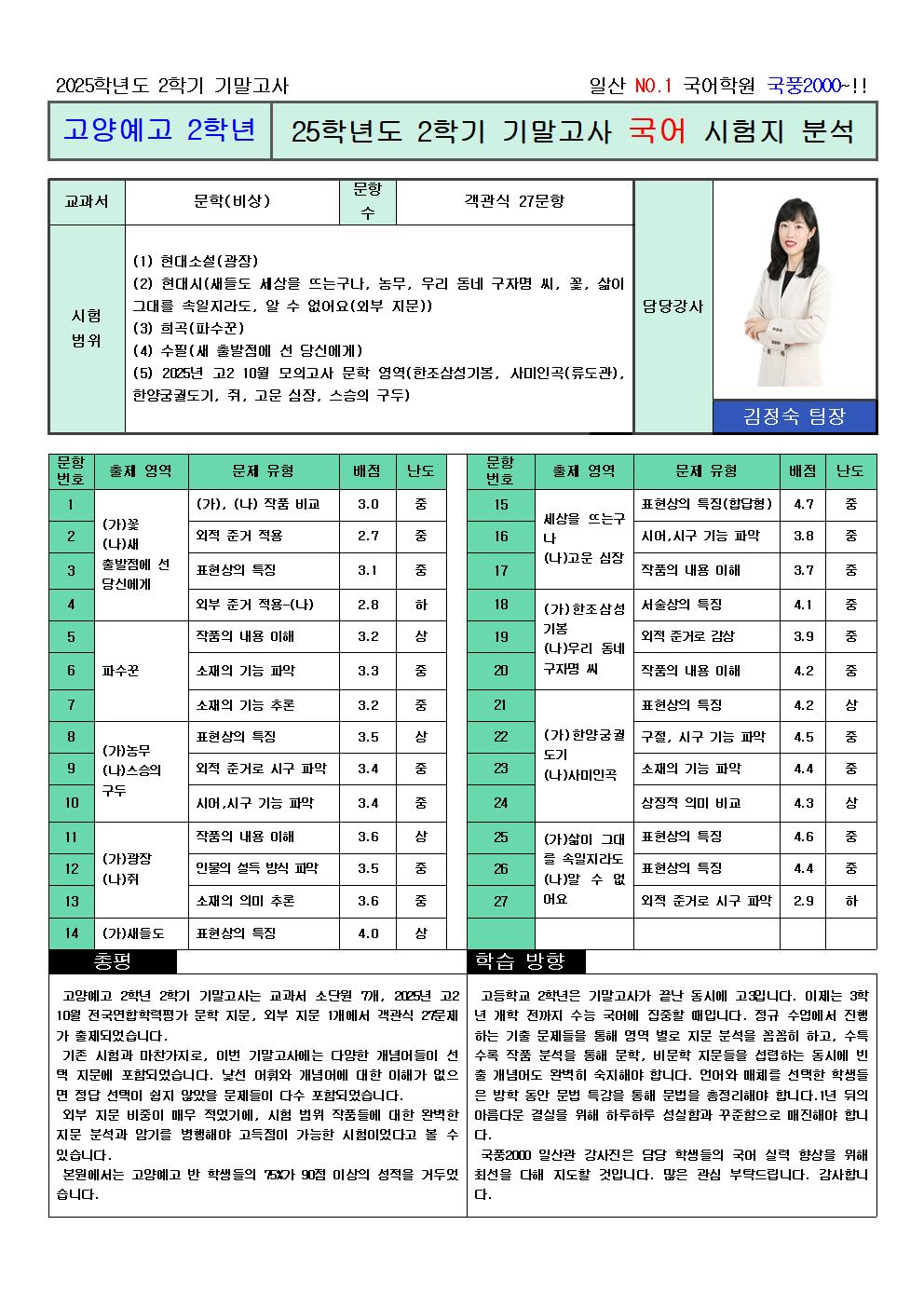 고양예고 2학년 2학기 기말고사는 교과서 소단원 7개, 2025년 고2 10월 전국연합학력평가 문학 지문, 외부 지문 1개에서 객관식 27문제가 출제되었습니다.